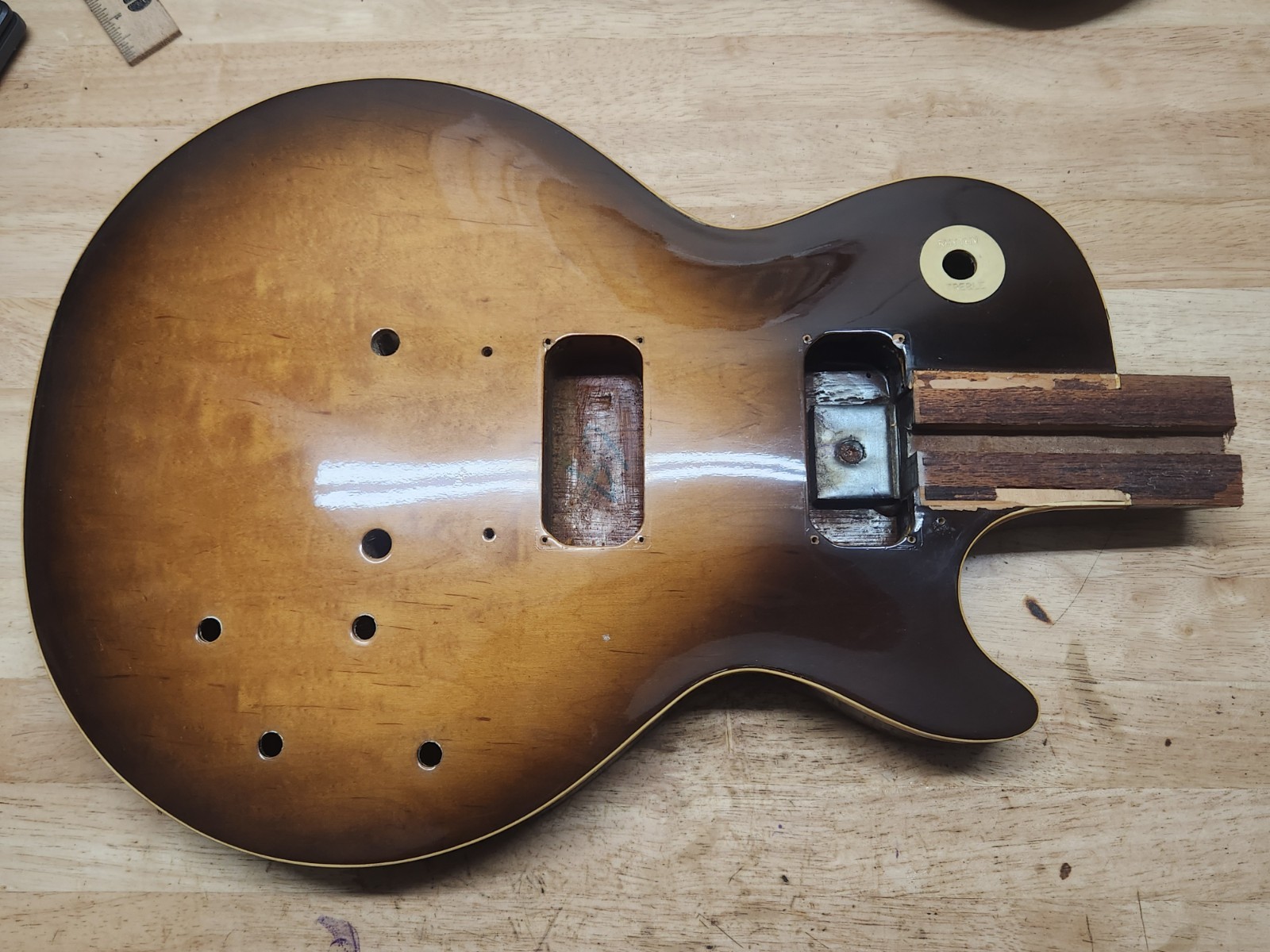 Die Gitarre war total verbastelt, mit Eigenbaukreation einer aktiven Elektronik gekrönt mit einer Dioden-Buchse. Da war kein Durchkommen mehr für irgendeinen Gitarrentechniker Zudem war das Binding stellenweise lose, die verbauten Tonabnehmer waren nicht mehr original. Deshalb wurde, da wo notwendig, leider ein Neuaufbau fällig ... more