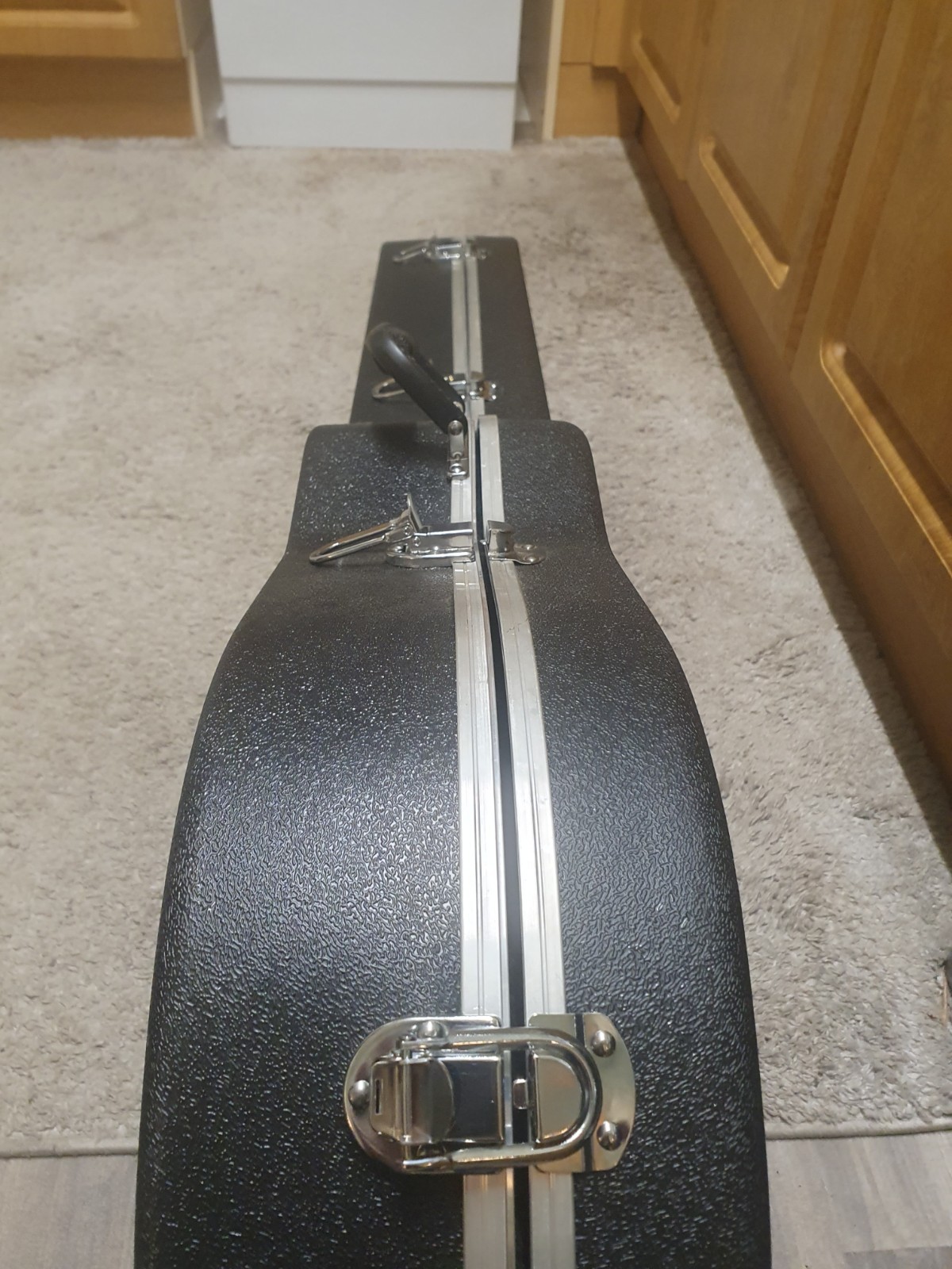 Lightly used but in great condition, upgraded with vintage style hipshot locking tuners, I can provide the original tuners in the case. Comes with pink lined hardcase and case candy
