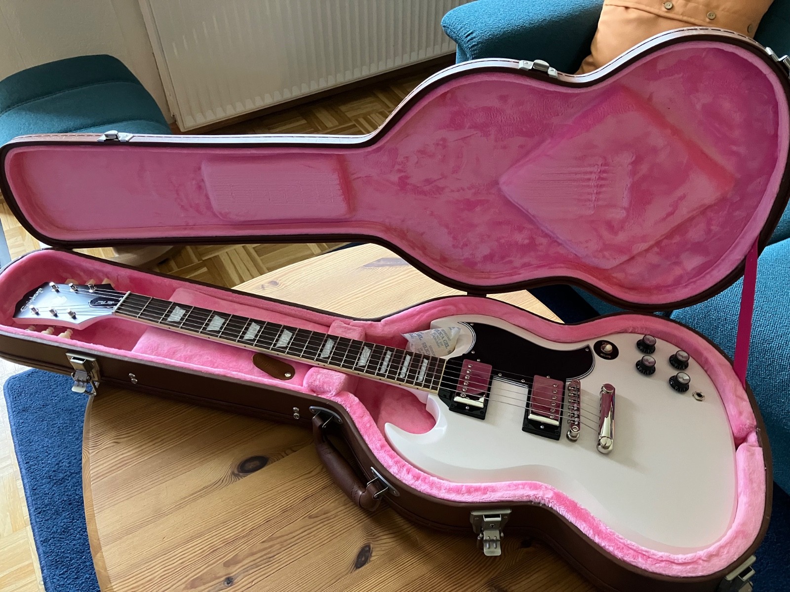 Allgemeine Beschreibung Mensur: 629 Hals: Mahagoni Farbe: Weiß Decke: Keine Griffbrett: Laurel Tonabnehmerbestückung: HH Variantengruppe: 1961 SG Inkl. Gigbag: Nein Bünde: 22 Tremolo: Nein Inkl. Koffer: Ja Korpus: Mahagoni Zubehör 1x Koffer, ... more